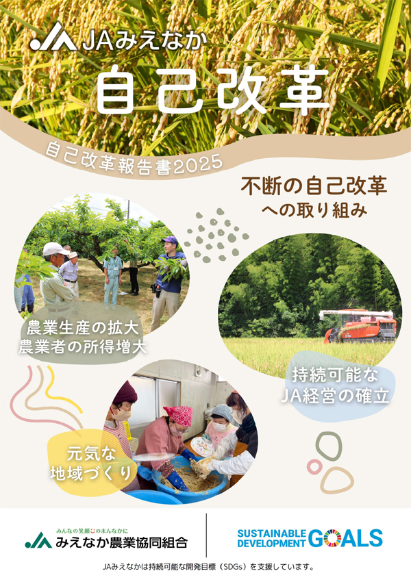 今後とも、JAみえなかは、地域になくてはならないJAであり続けるため、自己改革の実践を支える持続可能な経営基盤の確立・強化とともに、組合員との徹底した対話を通じ、総合事業を基本とした「不断の自己改革」に取り組んでまいります。