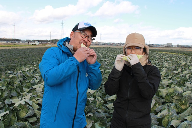 県外の大産地を視察した時、生産量では絶対敵わないと感じました。そこで安定供給するための主要品種も作りながら、美味しくて健康的なキャベツの生産に方向性を変え、15品種ほどを試験的に栽培。生食や加工などに向いているなど品種特性を探究し、栽培品種を決めました。栽培のこだわりは「毎日畑をよく見て防除は2回まで」と決めていること。また、化学肥料の代わりとしてバイオスティミュラント資材を使用し、根を強くすることで食味の良さにつなげています。私たちのキャベツを食べた友人に「キャベツの概念が変わった。キャベツを食べない子どもが食べた」と言ってもらえた時は嬉しかったです。